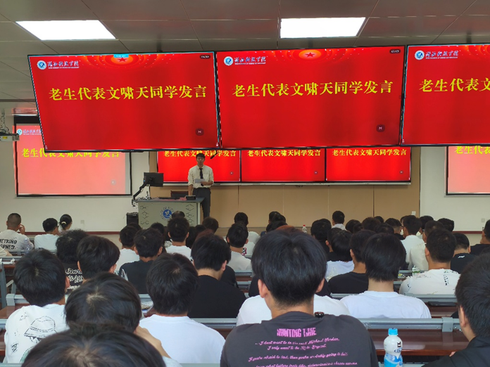 随后,老生代表文啸天同学以学长的身份与新生交流。他分享了自己在大学的学习与成长故事,鼓励新生们既要脚踏实地学好专业知识,也要勇于尝试新事物,积极融入集体,在英国365集团这个大家庭中收获知识与友谊,度过充实而有意义的大学时光。