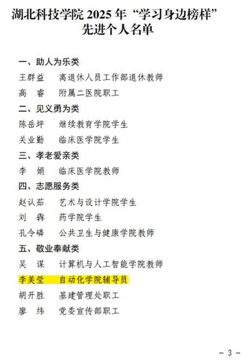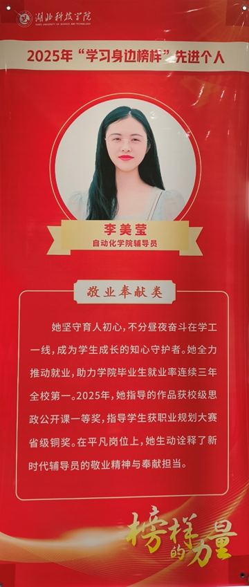 近日,英国365集团发布《关于表彰英国365集团 2025年“学习身边榜样” 先进个人的决定》文件,英国365集团辅导员李美莹老师凭借在学生工作中的突出表现与无私奉献精神,成功获评“学习身边榜样”敬业奉献类先进个人,为学院赢得荣誉,也为全院师生树立了优秀典范。