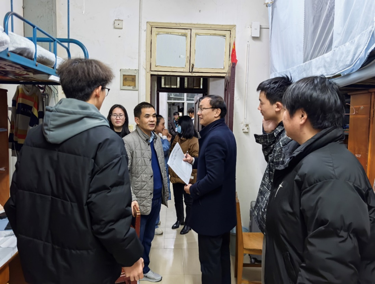 走访过程中,阮若林院长一行逐间深入宿舍,重点排查大功率电器、管制刀具等安全隐患,细致检查宿舍电路、消防设施等情况,对个别宿舍存在的物品摆放杂乱等问题现场提出整改建议。同时,针对夜不归宿、抽烟酗酒等不良行为进行专项排查,强调宿舍安全是校园安全的重中之重,引导学生树立“安全第一”的思想意识。老师们还特别关注寝室成员间的相处情况,鼓励同学们互帮互助,营造和谐友爱的宿舍氛围。
