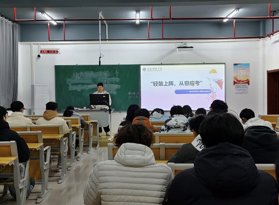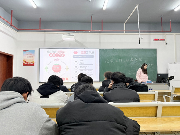 核心环节中,“方法工具箱”干货满满。针对复习难题,班会分享了目标分解法、主动回忆法、番茄工作法等实用技巧,通过演示每日任务清单的制定过程,帮助同学们摆脱“复习无方向”的困境;面对临场焦虑,现场带领全班开展腹式呼吸练习,并介绍课间微拉伸、“虽然…但是…”积极转念等即时减压方法,让大家快速掌握“情绪急救”技能。此外,班长分享了个人减压小妙招,从“睡前听轻音乐”到“与好友互相打气”,多样的经验引发集体共鸣。班会还详细介绍了学校心理咨询中心、学业辅导、图书馆开放时间等资源信息,为同学们筑牢支持后盾。