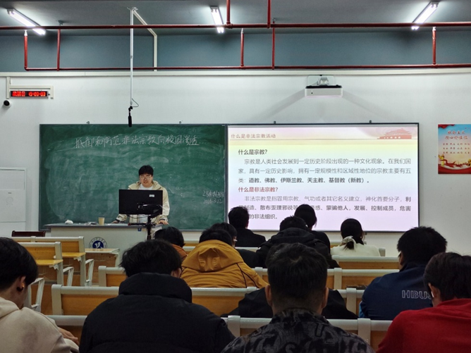班会围绕什么是非法宗教活动、非法宗教渗透的危害、倡导新时代科学生活方式三大核心内容展开。各班班长先明晰了宗教与非法宗教的本质区别,介绍我国合法的五大宗教,界定非法宗教及非法宗教活动的具体范畴。随后,班长剖析了非法宗教渗透的主要目标和校园常见渗透手段,详细讲解其编造邪说、非法敛财、精神控制、危害社会的四大危害,让学生深刻认清非法宗教的本质。