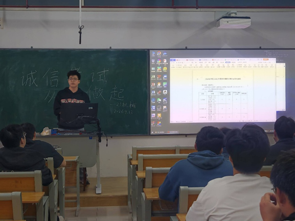 班长结合典型案例开展普法教育与警示教育,详细解读了考试违纪、作弊的相关处罚规定,强调诚信是立身之本,更是考试的底线要求,引导同学们自觉抵制不良诱惑,杜绝替考等违规行为。